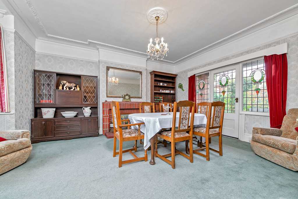 FAMILY ROOM /DINING ROOM 18' 4" into bay x 14' 0" max (5.59m x 4.27m) uPVC double glazed window to front aspect, wall mounted double panel radiator, brick built fireplace and tiled hearth, stained glass leaded light windows and doors to rear aspect and opening onto a covered veranda, picture rail, plaster coving, decorative stucco plaster ceiling.