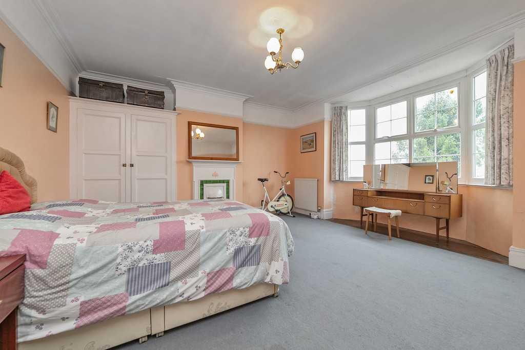 BEDROOM 17' 2" into bay x 15' 0" (5.23m x 4.57m) uPVC double glazed bay window to front aspect, cast iron fireplace with tiled surround, two wall mounted single panel radiators, picture rail, plaster coving to ceiling, fitted double wardrobe with hanging rail and shelf.