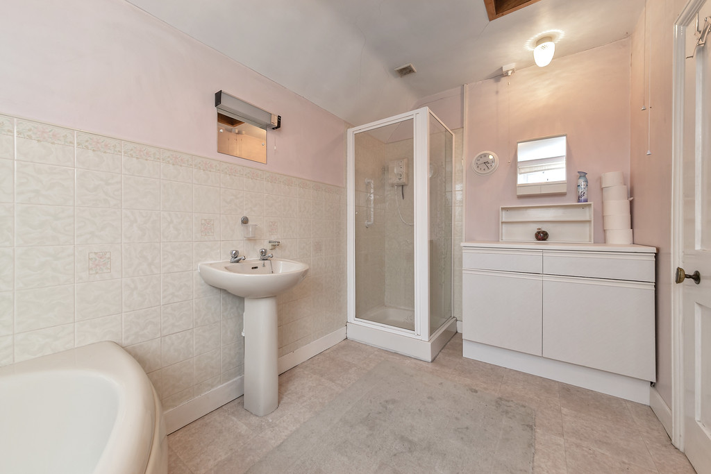 BATHROOM 12' 11" x 6' 6" (3.94m x 1.98m) uPVC double glazed part frosted window to rear aspect, four piece suite comprising panelled corner bath, shower cubicle with electric Triton shower, close coupled WC, pedestal mounted wash hand basin, tiled splash back, wall mounted shaver light point, wall mounted double panel radiator. Access to loft space.