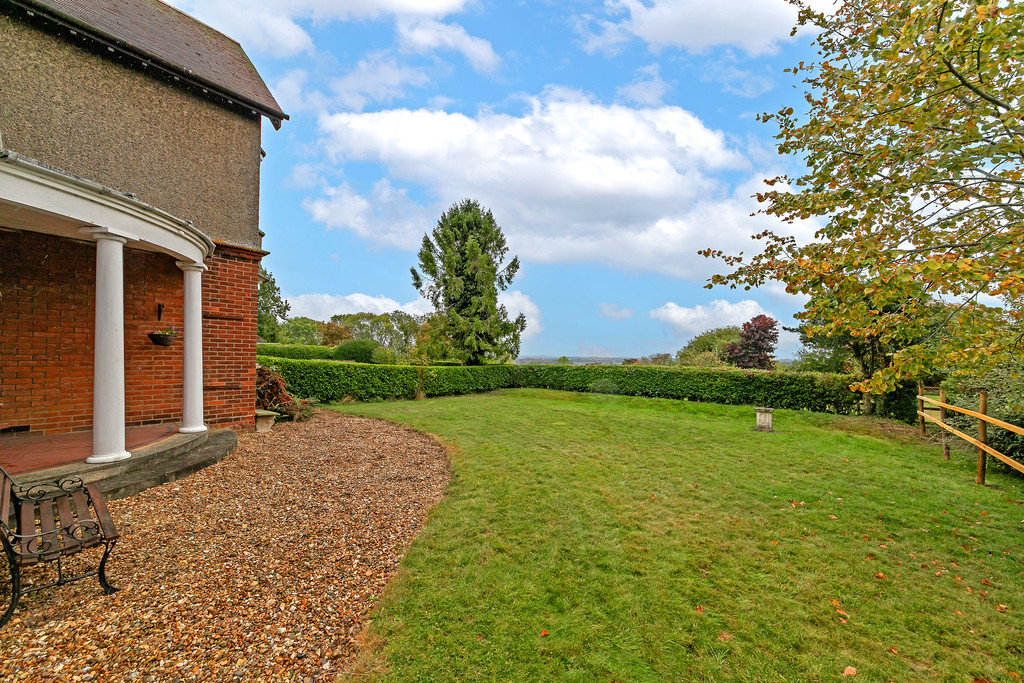 FRONT GARDEN Enclosed by low level hedges and fencing, mainly laid to lawn with curved shingled area with step up to front porch, south west facing views over distant fields and country side.