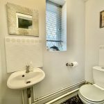 CLOAKROOM Frosted uPVC double glazed leaded light window to front aspect, close coupled WC, wall mounted wash hand basin with tiled splash back, wall mounted radiator.