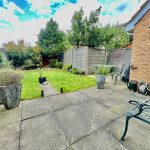 REAR GARDEN Paved patio across rear and extending behind garage. Garden mainly laid to lawn with shrubs, plants and tree borders, enclosed by timber panel fencing, outside tap, courtesy door to garage.