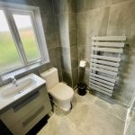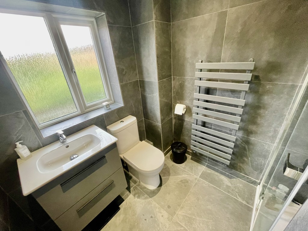 REFITTED SHOWER ROOM uPVC double glazed frosted window to rear aspect, walk in shower unit with rainfall shower and hand held attachment, close coupled WC, wall mounted wash hand basin with drawers under, tiled surround, tiled floor, spotlights to ceiling.
