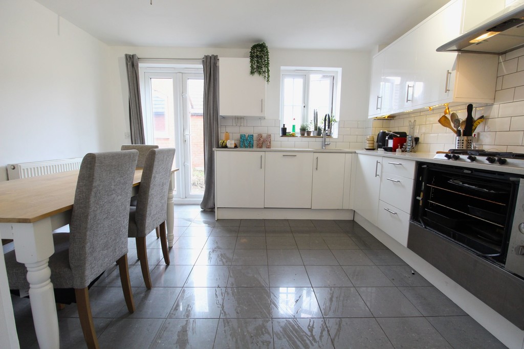 KITCHEN/DINER 12' 10" x 12' 9" (3.91m x 3.89m) uPVC double glazed window to rear elevation and uPVC double glazed French doors to rear elevation, double panel radiator, fitted modern kitchen comprising one bowl stainless steel sink drainer unit with mixer tap over, fitted work surfaces, range of base units incorporating built in oven (not currently working), built in gas hob over, space for fridge/freezer, built in dishwasher and built in washing machine both with matching doors, further range of wall mounted units incorporating fitted stainless steel extractor hood, tiled flooring, ideal space for table and chairs, built in under stairs storage cupboard.