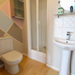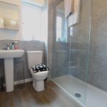 ENSUITE Single panel radiator, modern fitted three piece suite comprising low level W.C, wash hand basin with mixer tap over, fully tiled shower cubicle with fitted shower over, laminated wood effect flooring, extractor fan.